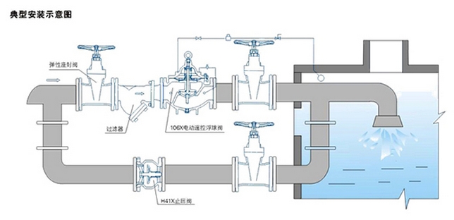 106X電動遙控浮球閥是在100X遙控浮球閥的基礎(chǔ)上添加了常開(常閉)型電磁裝置,使該閥具有雙保險作用,即使停電或電浮球失靈,也能控制水位,絕不會讓水位超過規(guī)定位置,電動浮球閥可以設(shè)置啟閉水位,解決主閥頻繁啟閉。該閥廣泛用于高層建筑、城市生活用水、消防、工礦企業(yè)水池,水塔的進水管道中。