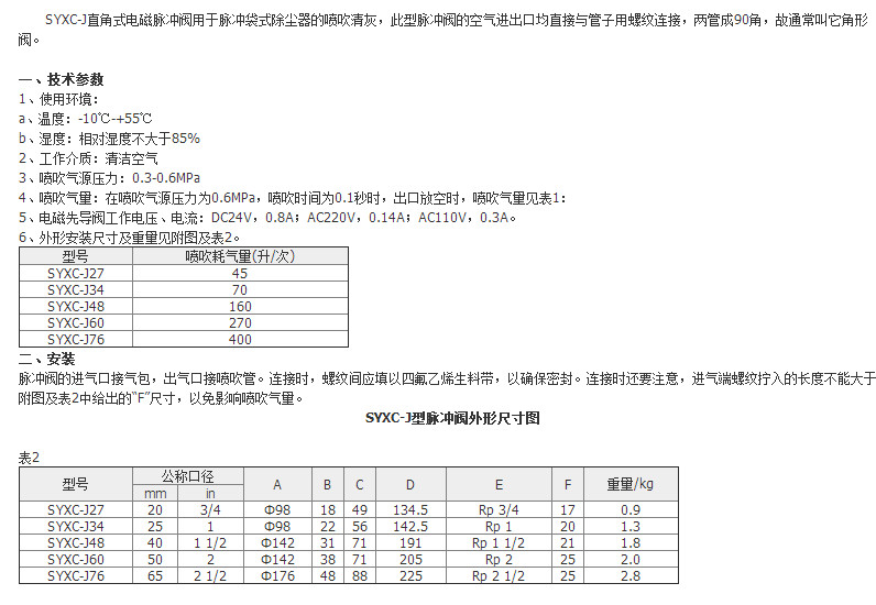 詳細(xì)信息 電磁脈沖閥SYXC-J27,SYXC-J34,SYXC-J48,SYXC-J60,SYXC-J76,