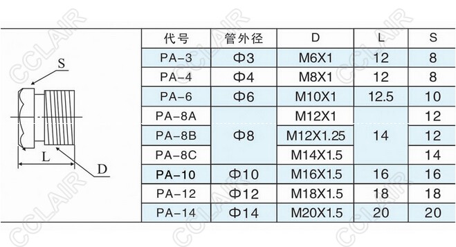 PA-3,PA-4,PA-6,PA-8A,PA-8B,PA-8C,PA-10,PA-12,PA14,油管接頭