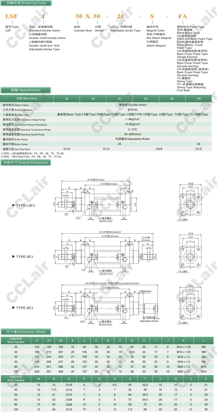 LSF32,LSF40,LSF50,LSF63,LSF80,LSF100,LSF100×200,LSF63×200,LSF40×100,LSF80×100,標(biāo)準(zhǔn)氣缸