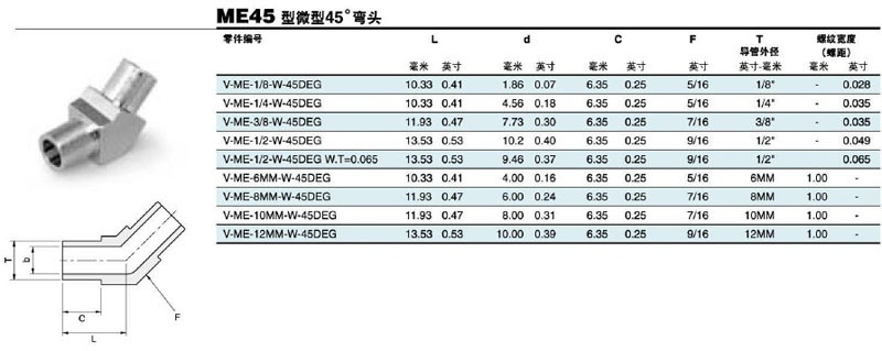 V-ME-1/8-W-45DEG,V-ME-1/4-W-45DEG,V-ME-3/8-W-45DEG,V-ME-1/2-W-45DEG,微型45度彎頭