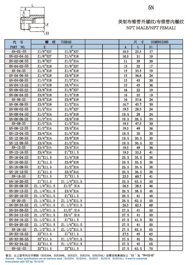 5N-02-SS,5N-04,5N-06,5N-08,5N-12,5N-16,5N-20,5N-24,5N-32, |
