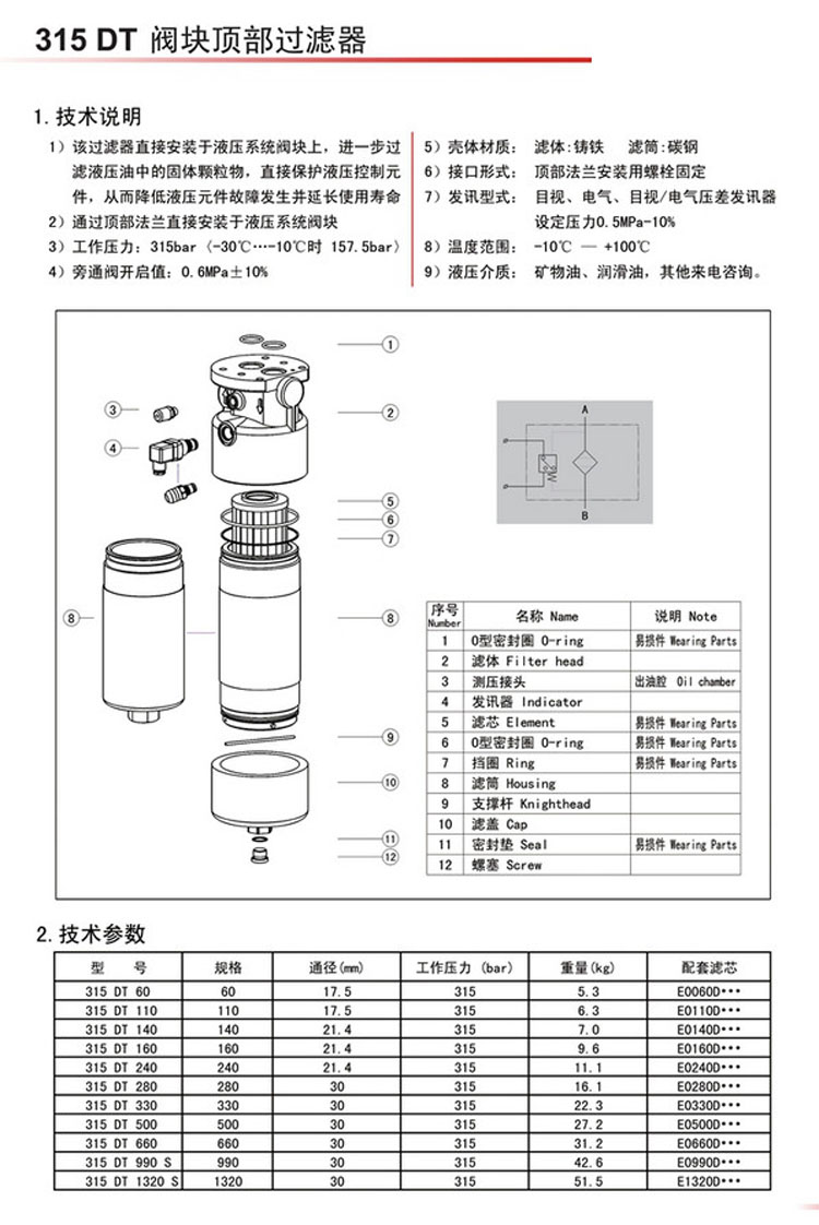 315DT60,315DT110,315DT140,315DT160,315DT240,315DT280,315DT330,315DT500,315DT660,315DT990S,315DT1320S,閥塊頂部過(guò)濾器