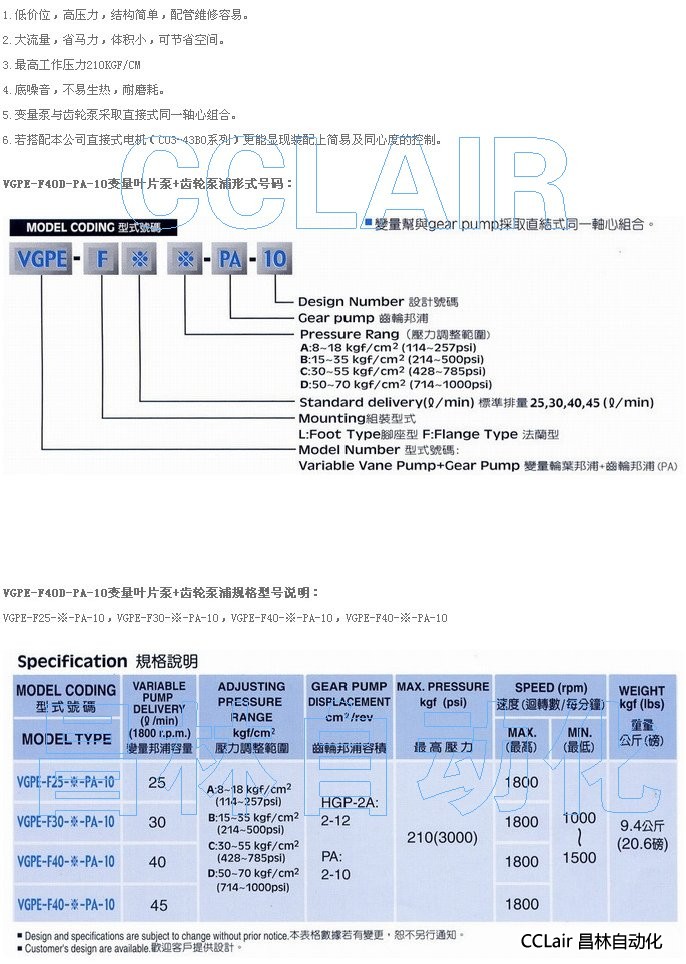 VGPE-F25C-PA-10,VGPE-F25B-PA-10,VGPE-F25A-PA-10,VGPE-F25D-PA-10,變量葉片泵+齒輪泵浦