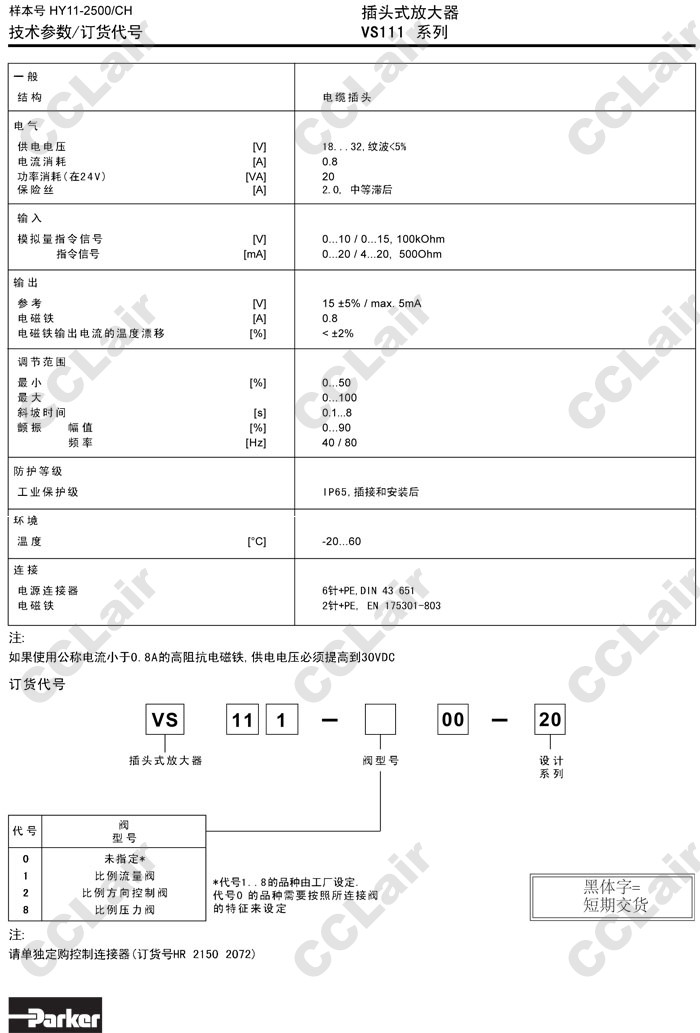 詳細(xì)信息 VS111-000-20,VS111-100-20,VS111-200-20,VS111-800-20,Parker插頭式放大器