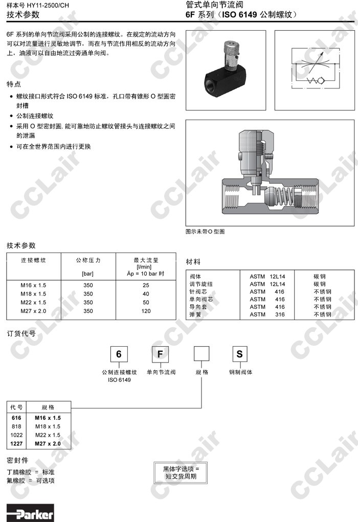 詳細(xì)信息 6F616S,6F818S,6F1022S,6F1227S,Parker管式單向節(jié)流閥