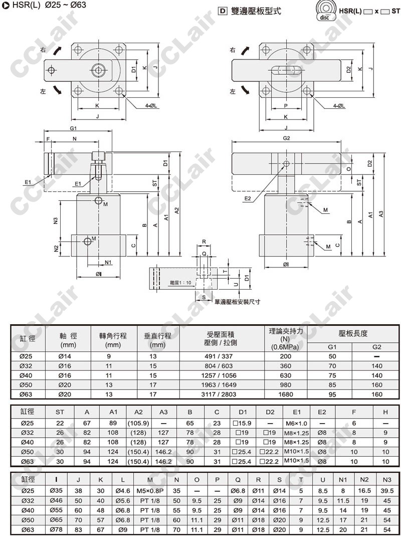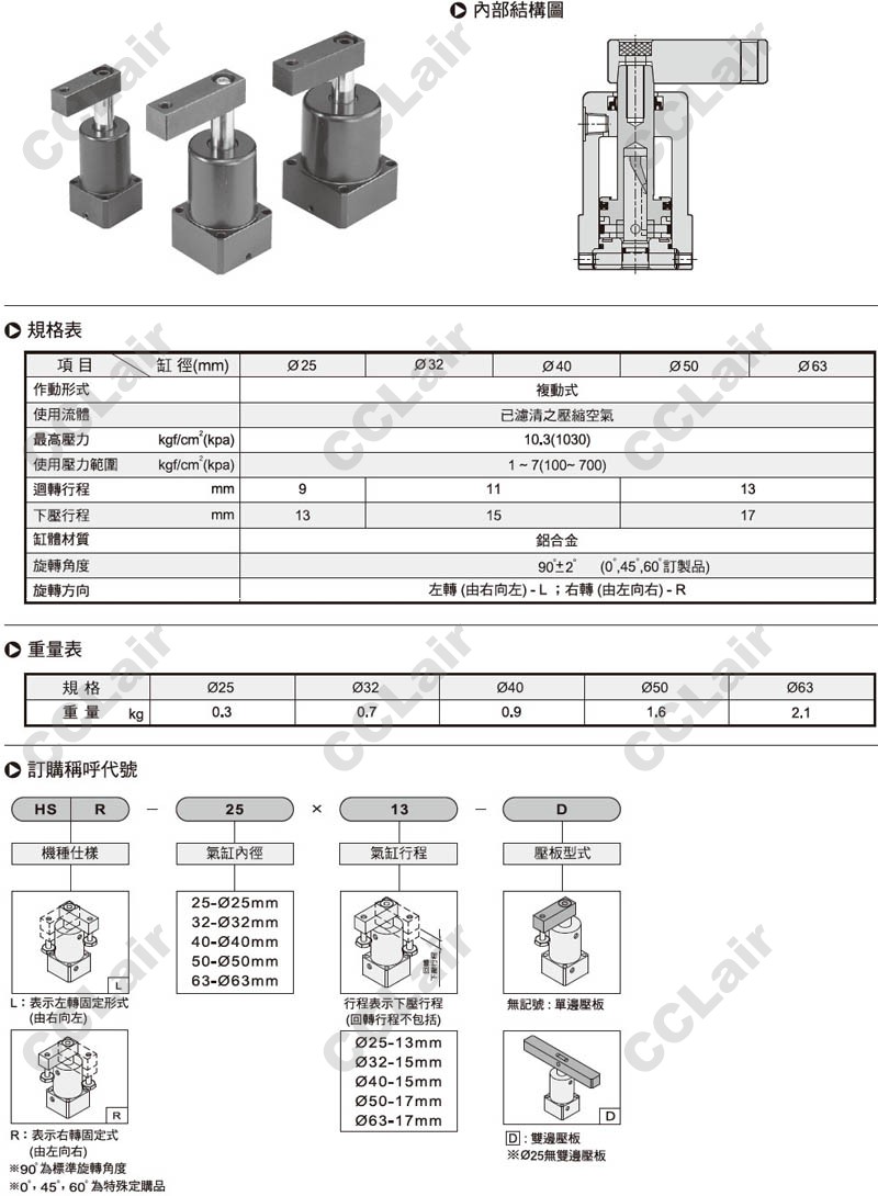 HSL-50*17,HSL-63*17,HSR-25*13-D,HSR-32*15-D,HSR-40*15-D,HSR-50*17-D,HSR-63*17-D,氣壓式轉角下壓缸