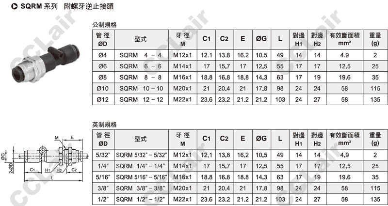 SQRM5/32-5/32,SQRM1/4-1/4,SQRM5/16-5/16,SQRM3/8-3/8,SQRM1/2-1/2,SQRM6-6,SQRM8-8,SQRM10-10,SQRM12-12,附螺牙逆止接頭