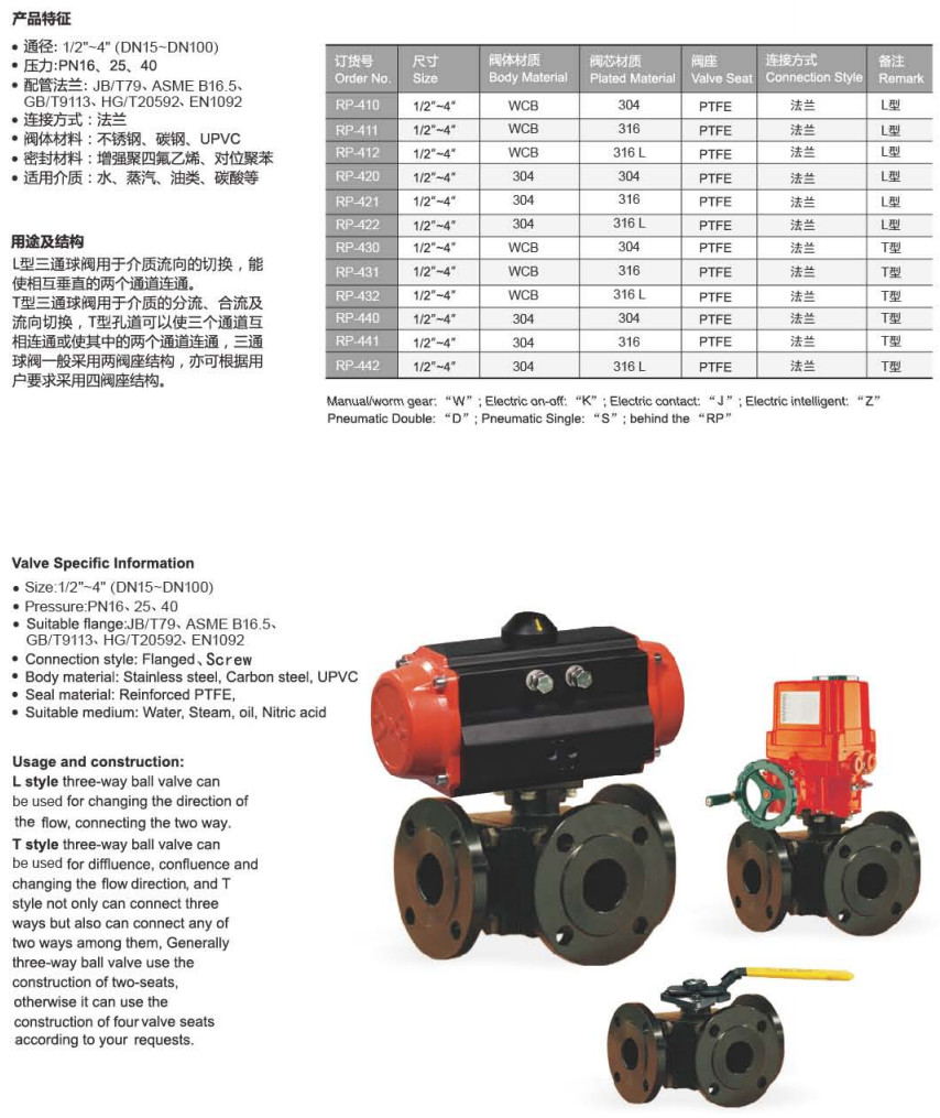 型號: RP-410,RP-411,RP-420,RP-422,RP-430,RP-431,RP-440,RP-441,三通球閥