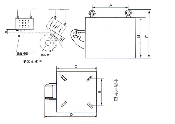 | 項目 | 適應(yīng)帶寬 | 額定吊高h(yuǎn) | 磁場強度 | 物料厚度 | 風(fēng)機功率 | 勵磁功率 | 適應(yīng)帶速 | 重量 | 外型尺寸mm | ||||