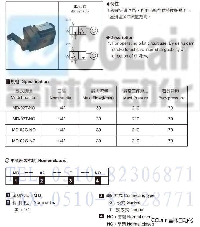 詳細信息 MD-02T-NO,MD-02T-NC,MD-02G-NO,MD-02G-NC,機械式換向閥
