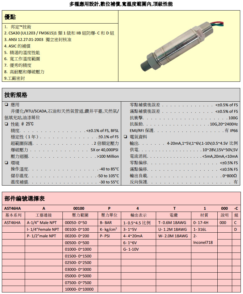 AST46HA-A-00050-B,AST46HA-P-02500-P,AST46HA-I-10000-K,不銹鋼介質(zhì)隔離變送器