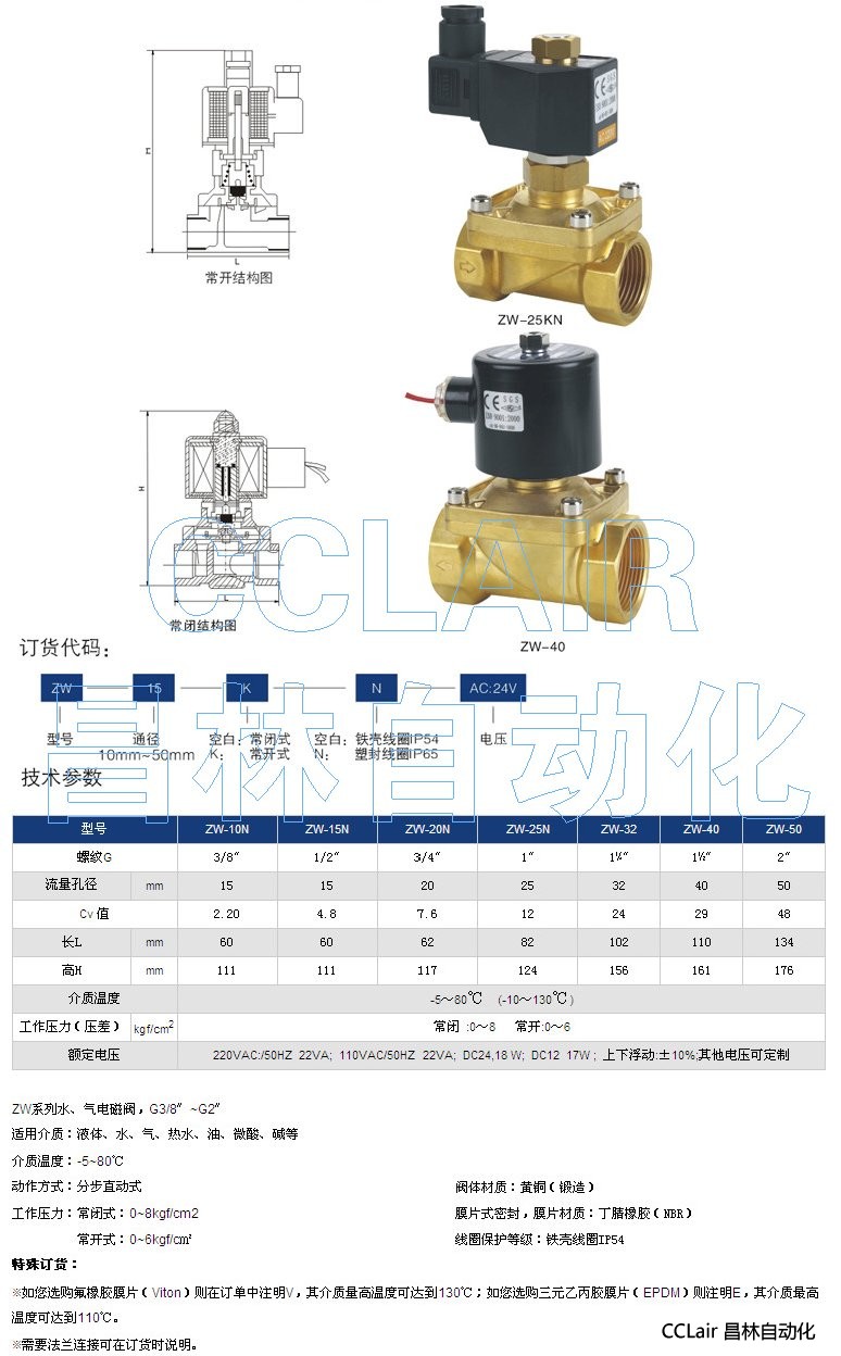 詳細信息 ZW-10N,ZW-15N,ZW-20N,ZW-25N,ZW-32,ZW-40,ZW-50,水、氣電磁閥,G3/8〞~G2〞