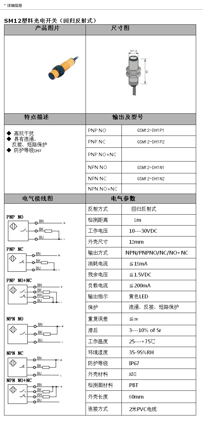 詳細信息 GSM12-DH1P1,GSM12-DH1P2,GSM12-DH1N1,GSM12-DH1N2,SM12塑料光電開關(回歸反射式)