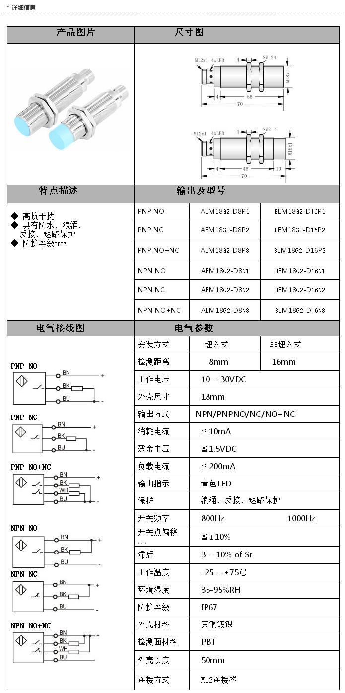 詳細(xì)信息 AEM18G2-D8P1,AEM18G2-D8P2,BEM18G2-D16N2,AEM18G2-D8N3,BEM18G2-D16N3,M18接插式接近開(kāi)關(guān)
