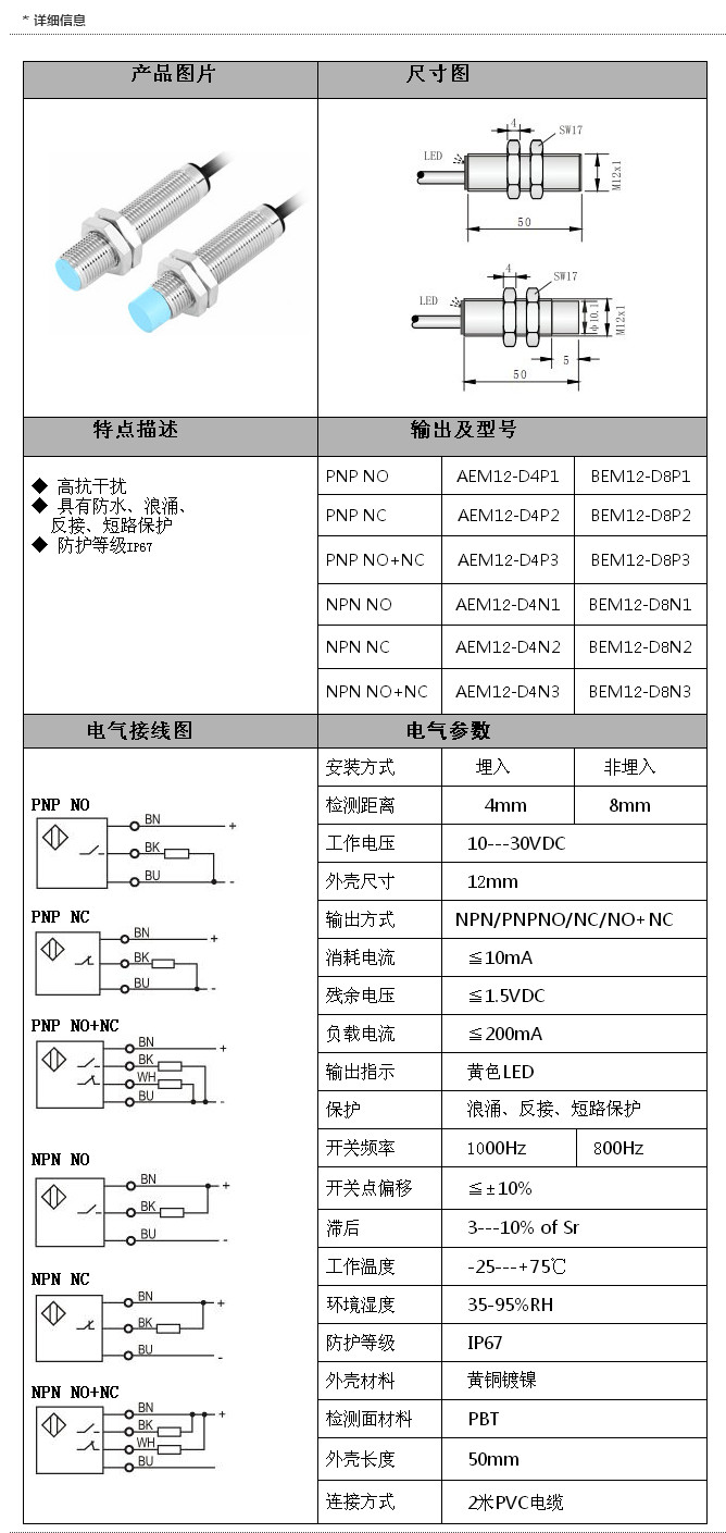 詳細(xì)信息 AEM12-D4P1,AEM12-D4P2,AEM12-D4N2,BEM12-D8N2,AEM12-D4N3,BEM12-D8N3,M12長(zhǎng)距離接近開(kāi)關(guān)