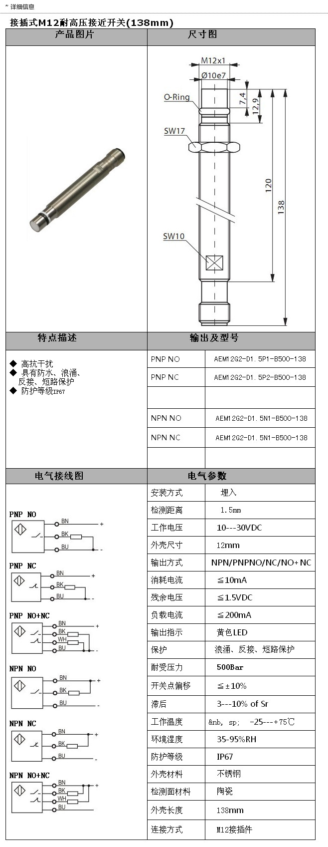 詳細信息 AEM12G2-D1.5P1-B500-138,AEM12G2-D1.5N1-B500-138,AEM12G2-D1.5N1-B500-138,M12接插式(138mm)
