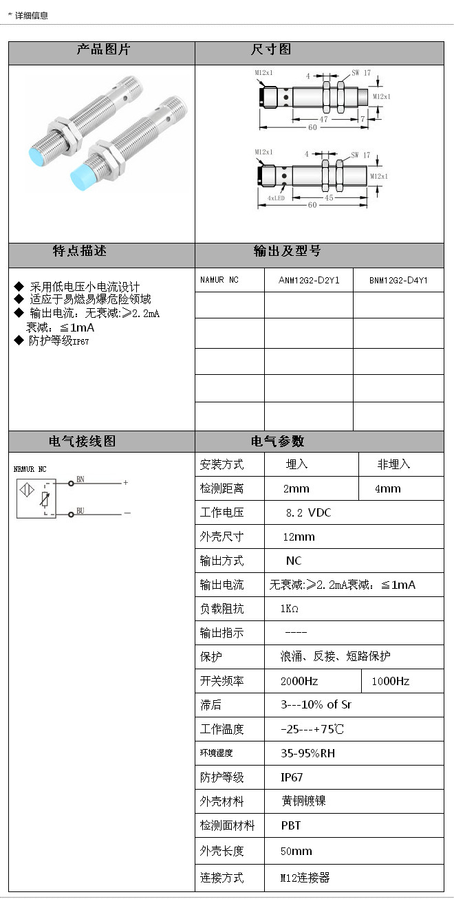 詳細信息 ANM12G2-D2Y1,BNM12G2-D4Y1,接插式M12本安接近開關