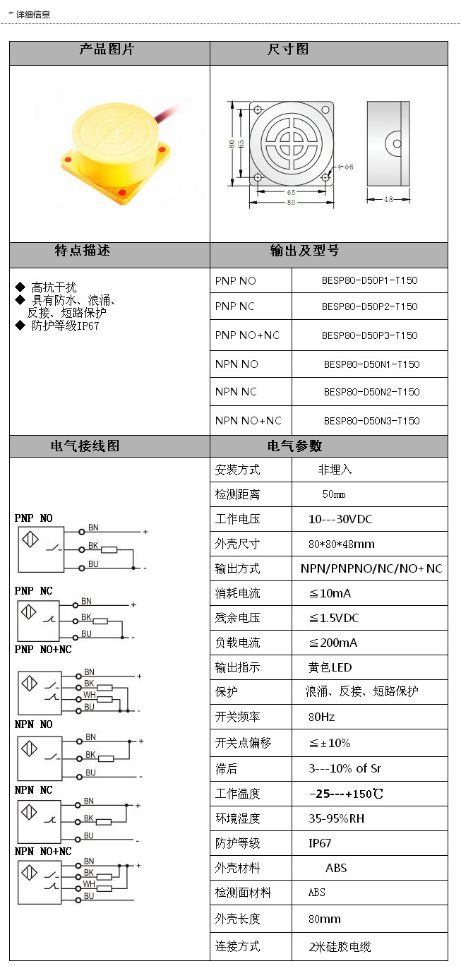 詳細信息 BESP80-D50P1-T150,BESP80-D50P3-T150,BESP80-D50N2-T150,BESP80-D50N3-T150,耐高溫SP80接近開關