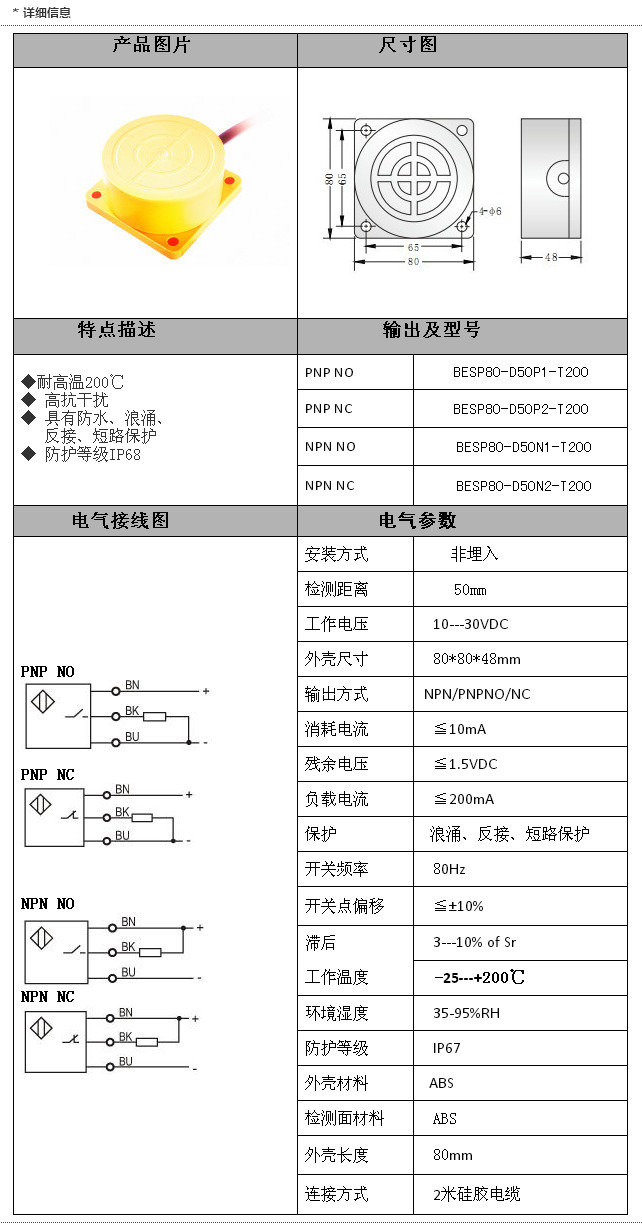 詳細信息 BESP80-D50P1-T200,BESP80-D50P2-T200,BESP80-D50N1-T200,BESP80-D50N2-T200,SP80耐高溫200℃接近開關