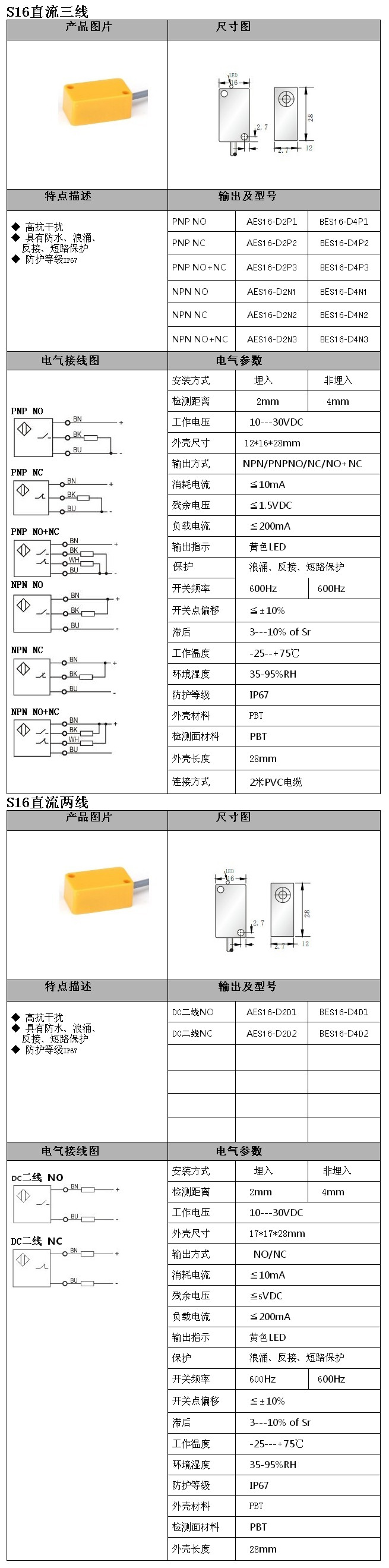 詳細(xì)信息 AES16-D2P1,BES16-D4P1,BES16-D4N2,AES16-D2N3,BES16-D4N3,BES16-D4D2,S16直流三二線接近開關(guān)