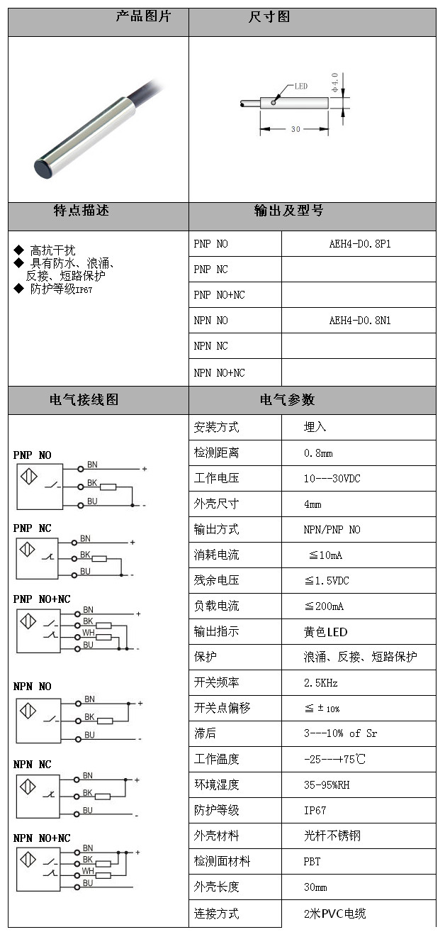AEH4-D0.8P1,AEH4-D0.8N1,Φ4直流三線電感式接近開(kāi)關(guān)