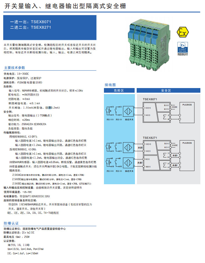TSEX8071,TSEX8271,開關(guān)量輸入、繼電器輸出型隔離式安全柵