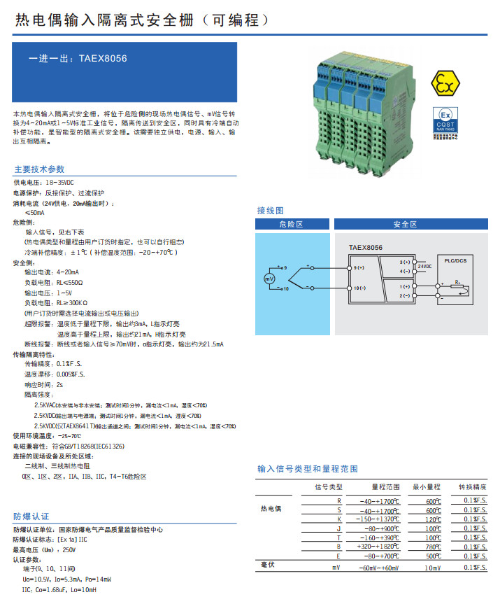 產(chǎn)品: 瀏覽次數(shù):1536TAEX8056,熱電偶輸入隔離式安全柵(可編程)