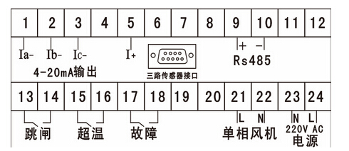 5、該裝置可對A、B、C三相繞阻溫度實現(xiàn)三路獨立的4~20mA模擬量輸出。