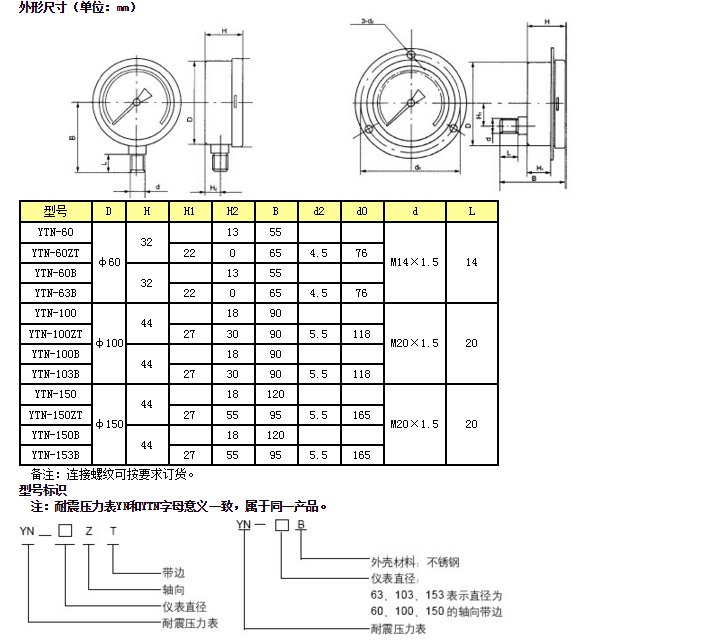 YTN、YTN-B/YJTFN系列不銹鋼耐震壓力表常壓型號(hào)