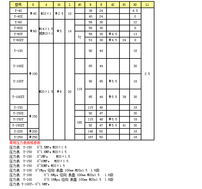 Y-40,Y-60,Y-100,Y-150,Y-250,Z-40,Z-60,Z-100,壓力真空表