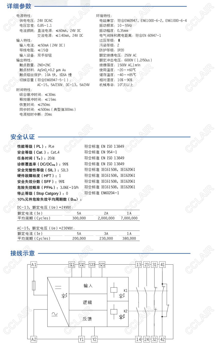 CZSR8001-3A1B是適用于雙手按鈕,具有3路NO(常開)安全輸出觸點(diǎn)和1路NC(常閉)輔助輸出觸點(diǎn)的安全繼電器。它具有雙通道輸入模式,可自動(dòng)復(fù)位,并具有不超過0.5s的同步檢測功能。
