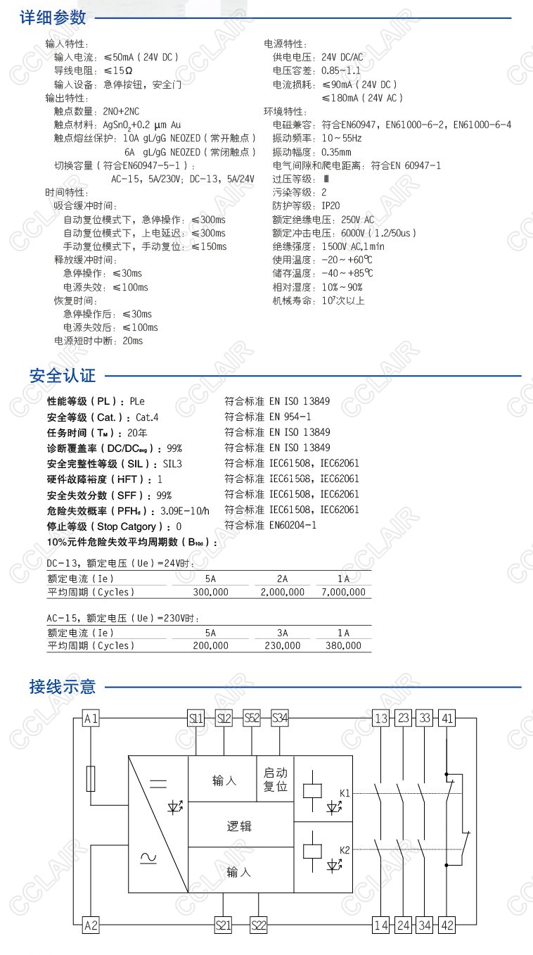 CZSR8001-2A2B是適用于急停按鈕、安全門控開關(guān)輸入,具有2路NO(常開)安全輸出觸點和2路NC(常閉)輔助輸出觸點的安全繼電器。它可選擇單雙通道操作,手動或自動復(fù)位,并具有通道間短路監(jiān)控功能。