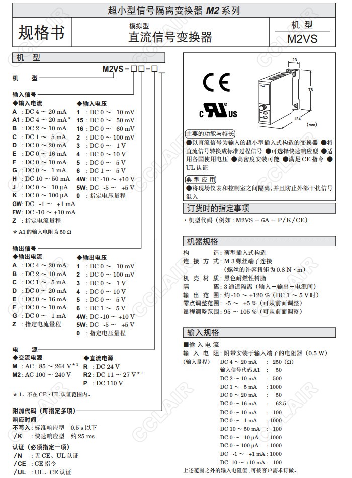 詳細(xì)信息 M2VS,M2VS-6A-P/K/CE,M2VS-A,M2VS-A1,M2VS-B,M2VS-C,M2VS-D,M2VS-E,直流信號(hào)變換器(模擬型)