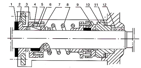 雙機(jī)械密封裝置主要由墊圈(1)內(nèi)靜環(huán)(2)動(dòng)環(huán)(3)動(dòng)環(huán)體(4)密封圈(5)(6)推環(huán)(7)彈簧(8)動(dòng)環(huán)(9)外靜環(huán)(10)靜環(huán)密封圈(11)防轉(zhuǎn)銷(12)等主要零件組成。