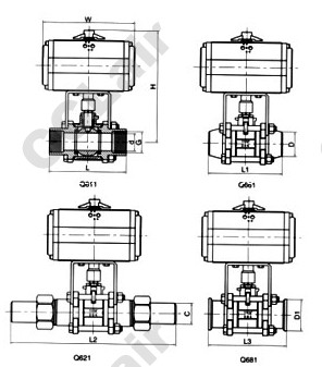 四、氣動(dòng)三片式球閥主要外形和連接尺寸單位(mm):