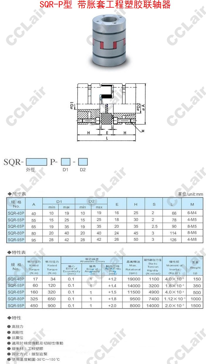 詳細(xì)信息 SQR-40P,SQR-55P,SQR-65P,SQR-80P,SQR-95P,帶脹套工程塑膠聯(lián)軸器