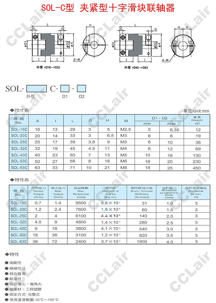 SOL-16C,SOL-20C,SOL-25C,SOL-32C,SOL-40C,SOL-50C,SOL-63C,夾緊型十字滑塊聯(lián)軸器