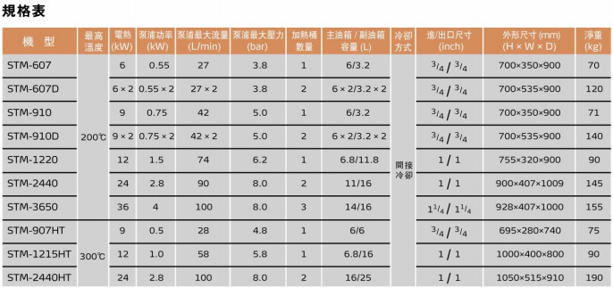 STM-607,STM-607D,STM-910,STM-910D,STM-1220,STM-2440,STM-3650,STM-907HT,STM-1215HT,STM-2440HT油式模具模溫機
