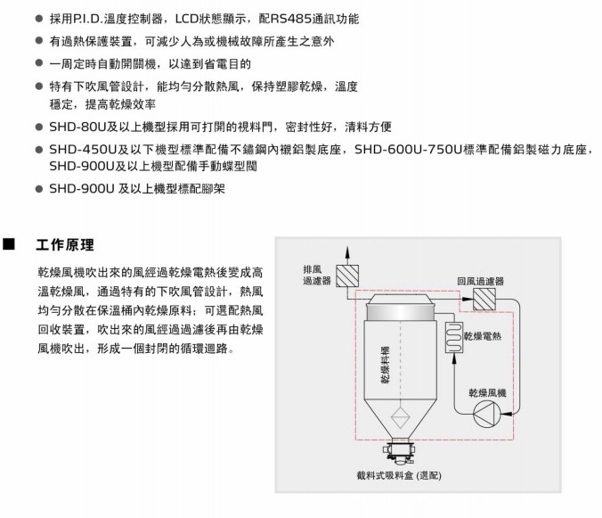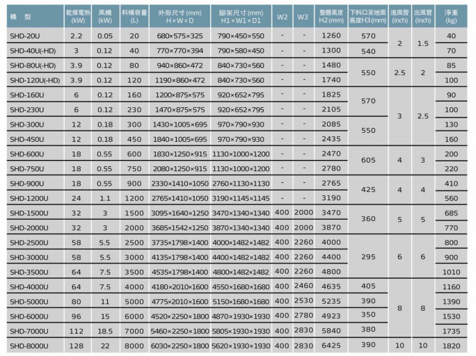 SHD-230U,SHD-300U,SHD-450U,SHD-600U,SHD-750U,SHD-900U,SHD-1200U,SHD-1500U,SHD-2000U,SHD-2500U,SHD-3000U,SHD-3500U,SHD-4000U,SHD-5000U,SHD-6000U,SHD-7000U,SHD-8000U,歐化料斗干燥機(jī)