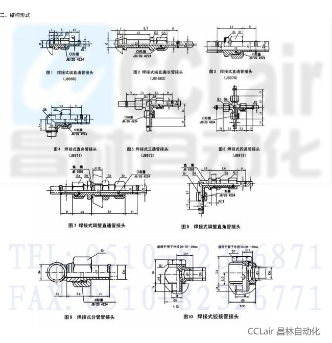焊接式端直通管接頭、焊接式端直通長管接頭、焊接式直通管接頭、焊接式直角管接頭,焊接式四通管接頭,焊接式隔壁直通管接頭、焊接式隔壁直角管接頭、焊接式分管管接頭、焊接式鉸接管接頭的型式和尺寸按圖1~圖10 和表1的規(guī)定。