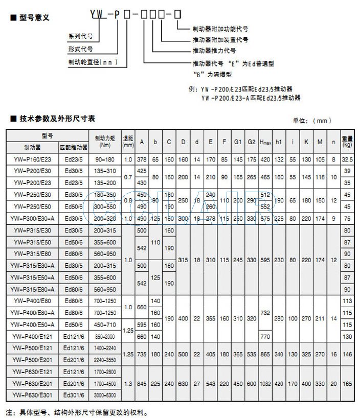 YW-P500/E201,YW-P630/E121,YW-P630/E201,YW-P630/E301,電力液壓鼓式制動器