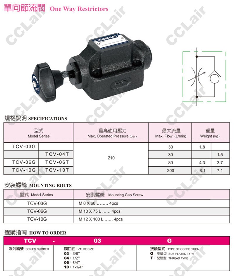TCV-03G,TCV-04T,TCV-06G,TCV-06T,TCV-10G,TCV-10T,ASHUN油順單向節(jié)流閥