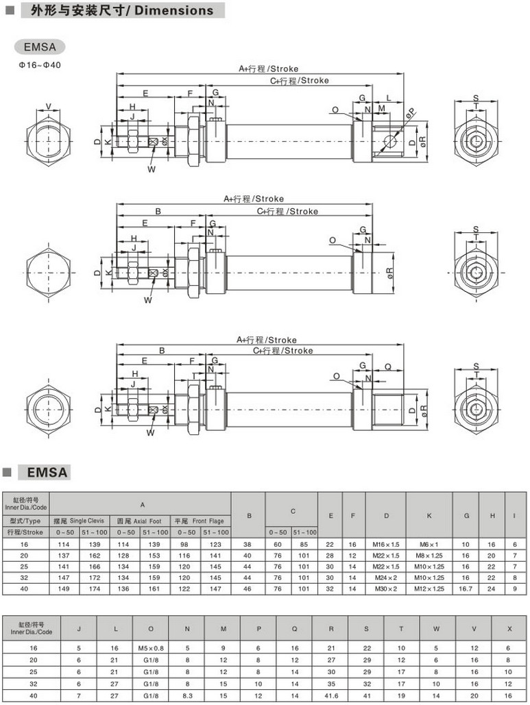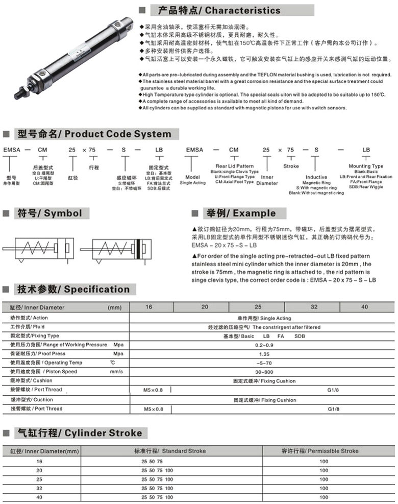EMSA-CM16*25,EMSA-CM20*50,EMSA-CM25*75,EMSA-U32*100,EMSA-U40*25,不銹鋼迷你氣缸