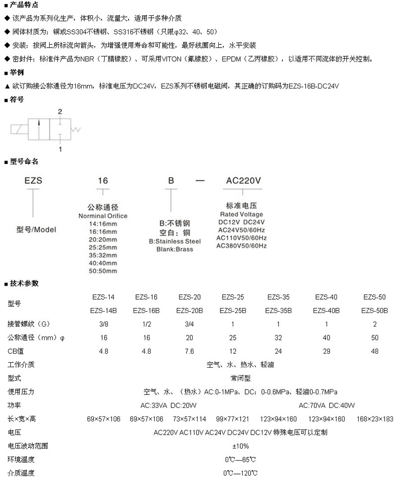 詳細(xì)信息 EZS-14,EZS-16B,EZS-20,EZS-25B,EZS-35,EZS-40,EZS-50,二位二通直動式電磁閥