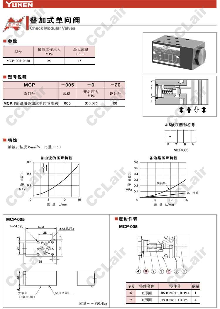 詳細信息 MCP-005-0-20,疊加式單向閥,YUCIYUKEN榆次油研