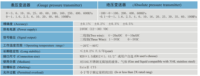 YD322-IE壓力變送器是由帶隔離膜充油壓力傳感器和儀表專用集成放大電路組成,使其具有精度高、穩(wěn)定性好、壽命長、可靠性高、安裝方便等特點。適用于各種液體、氣體的壓力測量。 技術參數(shù)