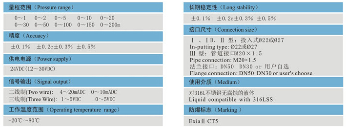 詳細信息 YD322-II,投入式液位變送器 YD322-II液位變送器由全密封隔離膜充油液位傳感器和儀表專用電路組成,具有測量精度高、穩(wěn)定性好、壽命長、安裝方便等優(yōu)點。采用獨特的工藝密封結構形式,防滲漏性能好,長期浸入液體中工作可靠。 技術參數(shù)