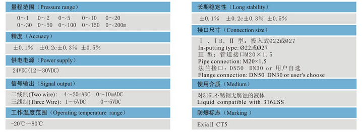 YD322IIC液位變送器由全密封隔離膜充油液位傳感器和儀表專用電路組成,具有測量精度高、穩(wěn)定性好、壽命長、安裝方便等優(yōu)點(diǎn)。采用獨(dú)特的工藝密封結(jié)構(gòu)形式,防滲漏性能好,長期浸入液體中工作可靠。