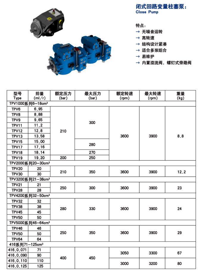 詳細(xì)信息 TPV6,TPV8,TPV9,TPV11,TPV12,TPV13,TPV15,TPV17,TPV18,TPV19,TPV20,閉式回路變量柱塞泵 TPV30,TPV21,TPV28,TPV32,TPV38,TPV45,TPV50,TPV46,TPV50,TPV64, 146.0.071,416.0.090,416.0.110,416.0.125,